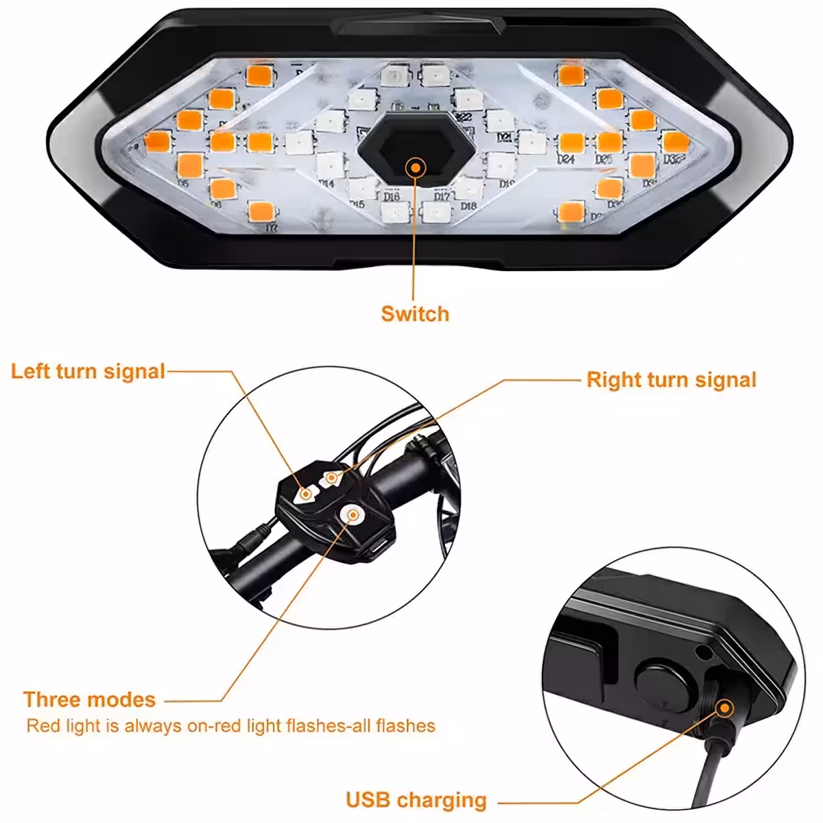 Tālvadības pults ir aprīkota ar 3 lielām pogām intuitīvai lietošanai brauciena laikā, ar darbības attālumu līdz 3,5 metriem. Signāli pa kreisi/pa labi tiek uzreiz nosūtīti uz aizmugurējo LED lampu.