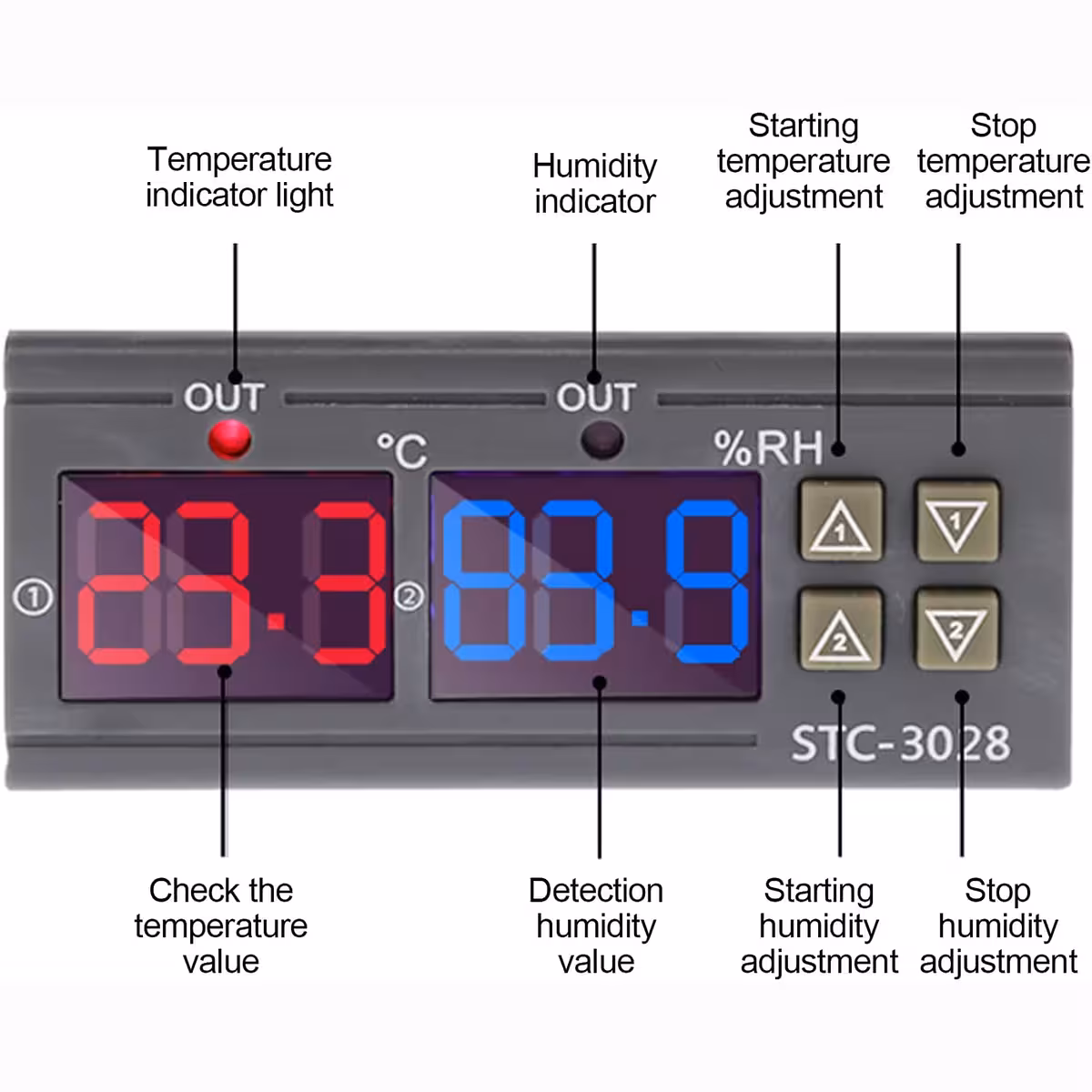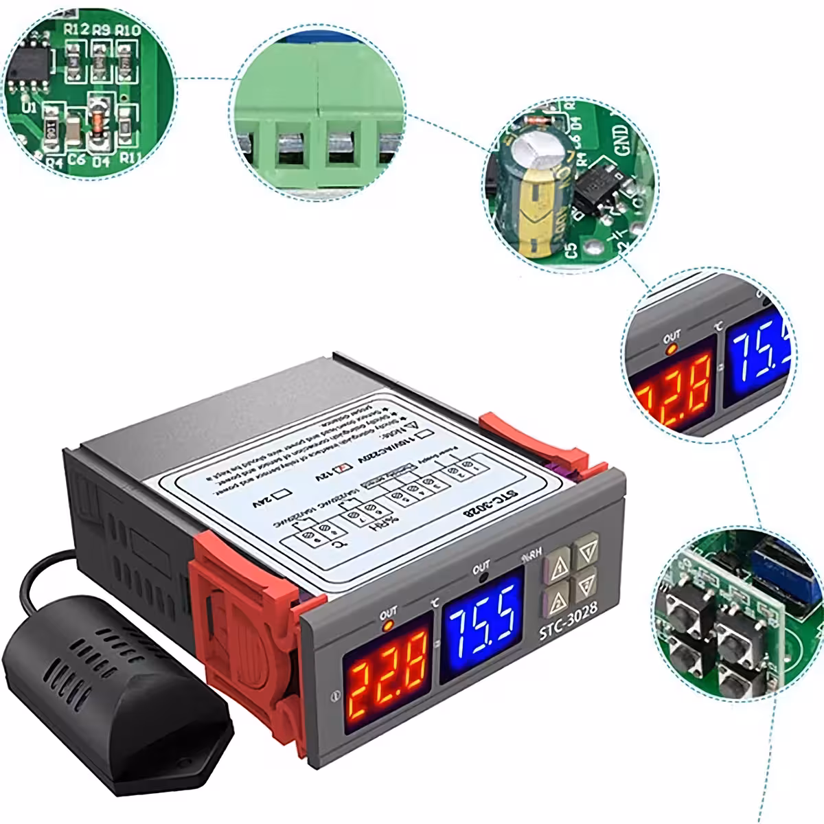 Šis STC-3028 daudzfunkcionālais elektroniskais kontrolieris ļauj automātiski uzraudzīt un regulēt temperatūru un mitrumu dažādās mājsaimniecības vai rūpniecības lietojumprogrammās. Aprīkots ar diviem digitālajiem ekrāniem – sarkanu temperatūrai un zilu mitrumam – un diviem neatkarīgiem releju izvadiem 10A katrs, šis digitālais termostats un higrostats ir pilnīga un viegli konfigurējama risinājuma izvēle.