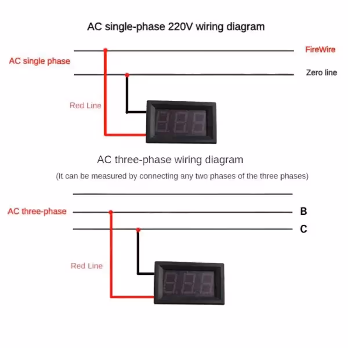 Šis digitālais voltmetrs ir īpaši paredzēts sprieguma mērīšanai maiņstrāvas (AC) sistēmās. Tas efektīvi darbojas vienfāzes sistēmās, mērot spriegumu starp fāzi un nulli, kā arī trīsfāžu sistēmās, mērot spriegumu starp jebkurām divām fāzēm. Barošana tiek nodrošināta tieši no mērāmā sprieguma, bez ārēja barošanas avota.