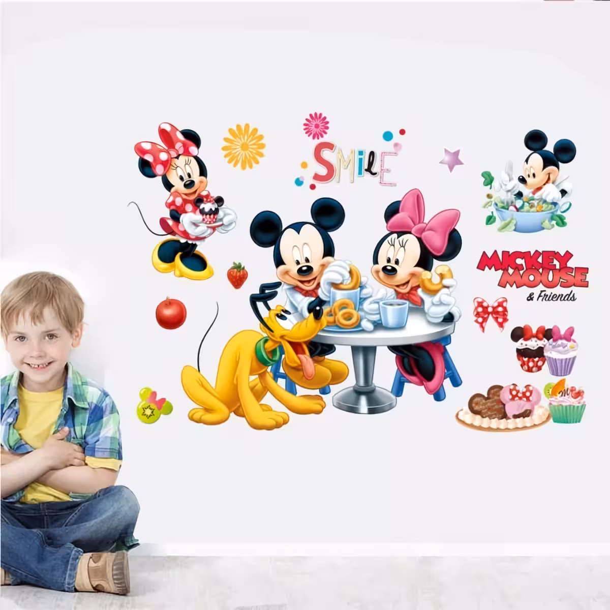 Pašlīmējoša dekoratīva uzlīme sienai vai mēbelēm, ideāli piemērota bērnu istabām, zīdaiņiem, bērnudārziem vai rotaļu laukumiem. Ar mīļajiem tēliem Mickey Mouse, Minnie Mouse un Pluto šis krāsainais komplekts pārvērš jebkuru telpu par jautru un radošu stūrīti.