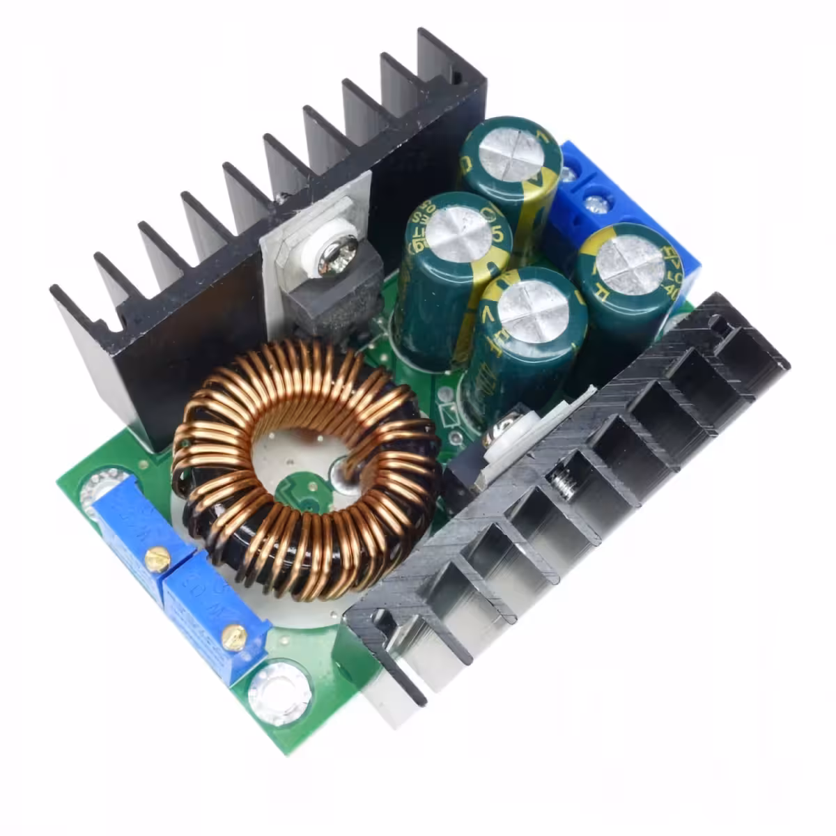 Regulēšana tiek veikta ar 25 apgriezienu potenciometriem, kas nodrošina smalku un stabilu pielāgošanu ar efektivitāti līdz 95%. Modulī ir iebūvēta īssavienojuma aizsardzība, un polaritātes maiņas aizsardzībai ieteicams izmantot diodi.