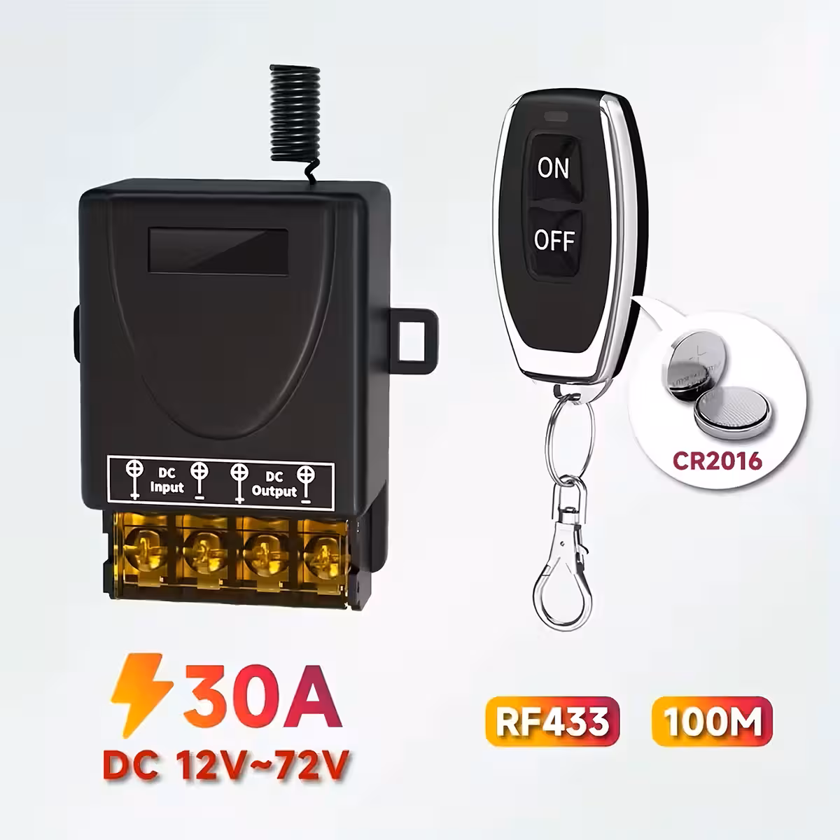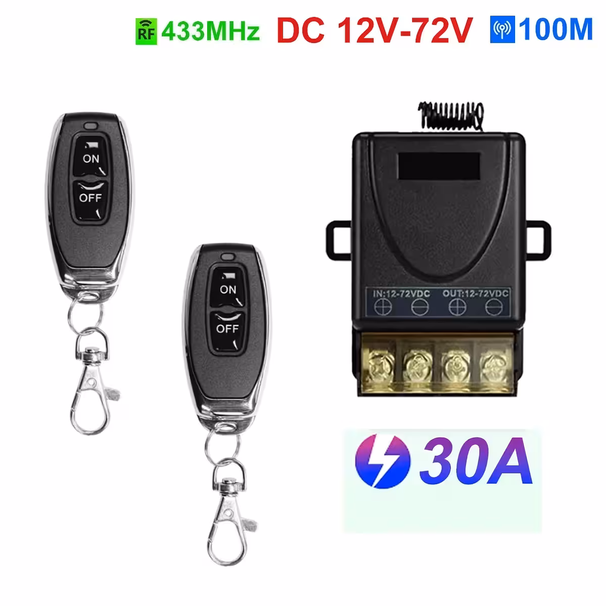 Šis relejs ar tālvadības pulti 12V–60V 30A ir augstas jaudas slēdzis, ideāls attālinātai sūkņu, apgaismojuma, iekārtu, kontaktligzdu, auto vai mājas sistēmu un viedās mājas instalāciju kontrolei. Darbojas 433.92MHz RF frekvencē un tiek piegādāts ar 2 tālvadības pultīm.