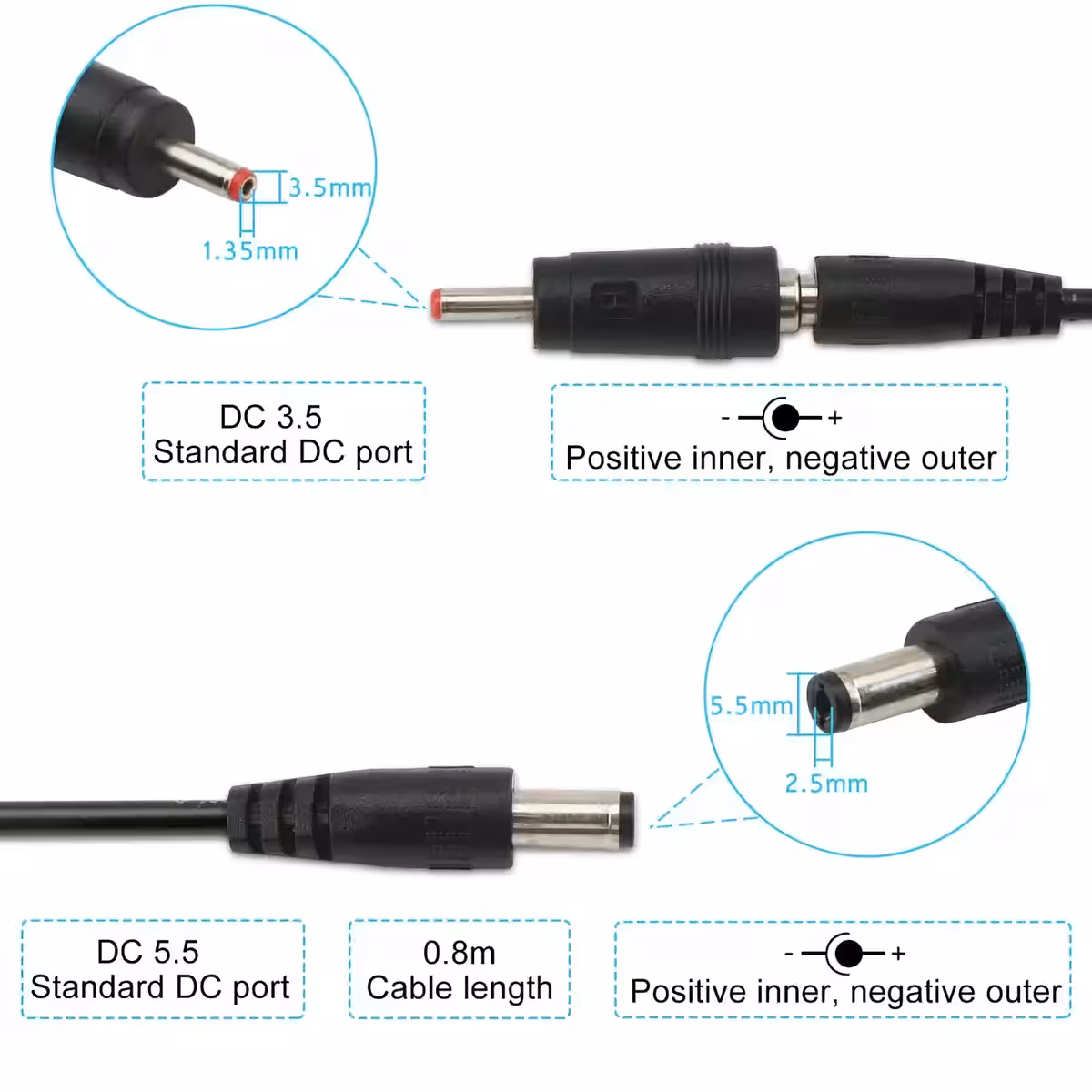 DC 5.5 x 2.5 mm (iekļauts arī adapteris DC 3.5 x 1.35 mm + sieviešu 5.5 x 2.5 mm)