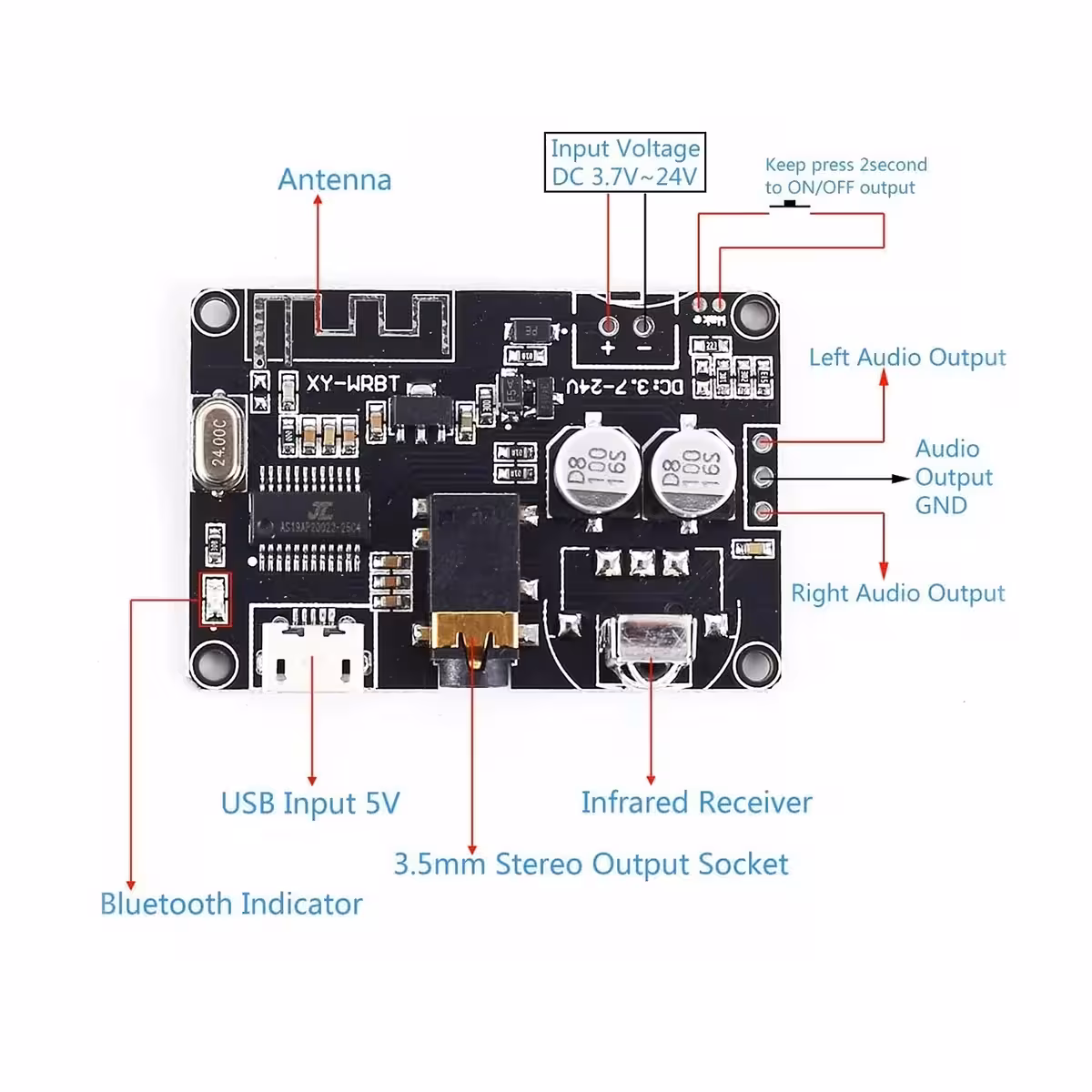 XY-WRBT ir moderns Bluetooth audio dekodera modulis, aprīkots ar iekļautu tālvadības pulti pilnīgai attālinātai vadībai. Ideāli piemērots integrēšanai DIY projektos, šis audio uztvērējs nodrošina stabilu savienojumu un augstas kvalitātes stereo atskaņošanu.