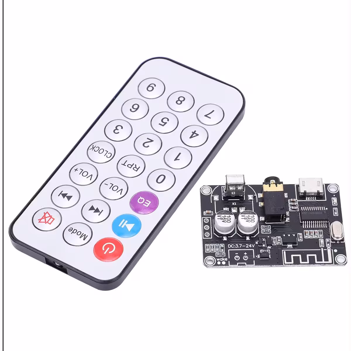 XY-WRBT Bluetooth modulis ar tālvadības pulti, BLE 5.0, stereo 3.7–24V, 3.5 mm ligzdu un skaļuma kontroli. Ideāli DIY skaļruņiem un pastiprinātājiem.